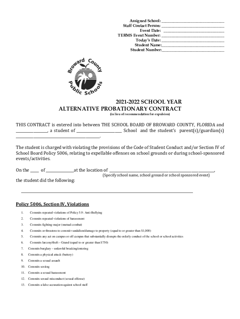Assigned School: ___ Staff Contact Person: ___ Event Date: ___ TERMS Event Number: ___ Today's Date: ___ Student Name:___ Student Number:___20212022 SCHOOL YEAR ALTERNATIVE PROBATIONARY CONTRACT (in