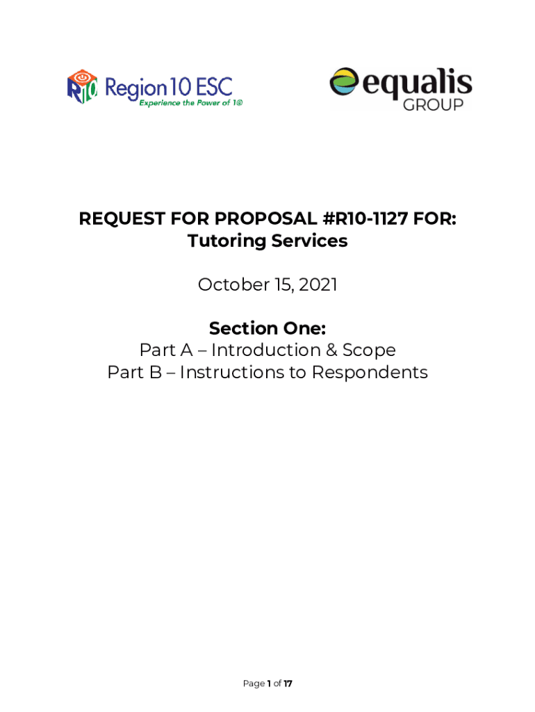 REQUEST FOR PROPOSAL #R101127 FOR: Tutoring Services October 15, 2021, Section One: Part A Introduction & Scope Part B Instructions to Respondents Page 1 of 17SECTION ONE: PART A INTRODUCTION AND