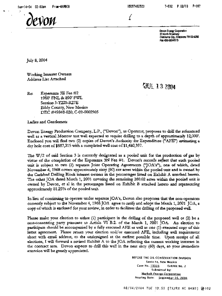 Sep1404 02:02pm FromMARBOBdevon15057462523T632 P.02/13 F267Devon Energy Corporation 20 North Broadway Oklahoma City, Oklahoma 731024260 Fax 4054528113July 8, 2004 Working Interest Owners Address List