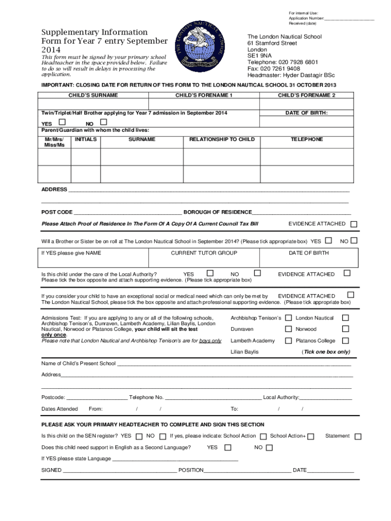 Get the free Supplementary Information Form Year 7 Application for ...