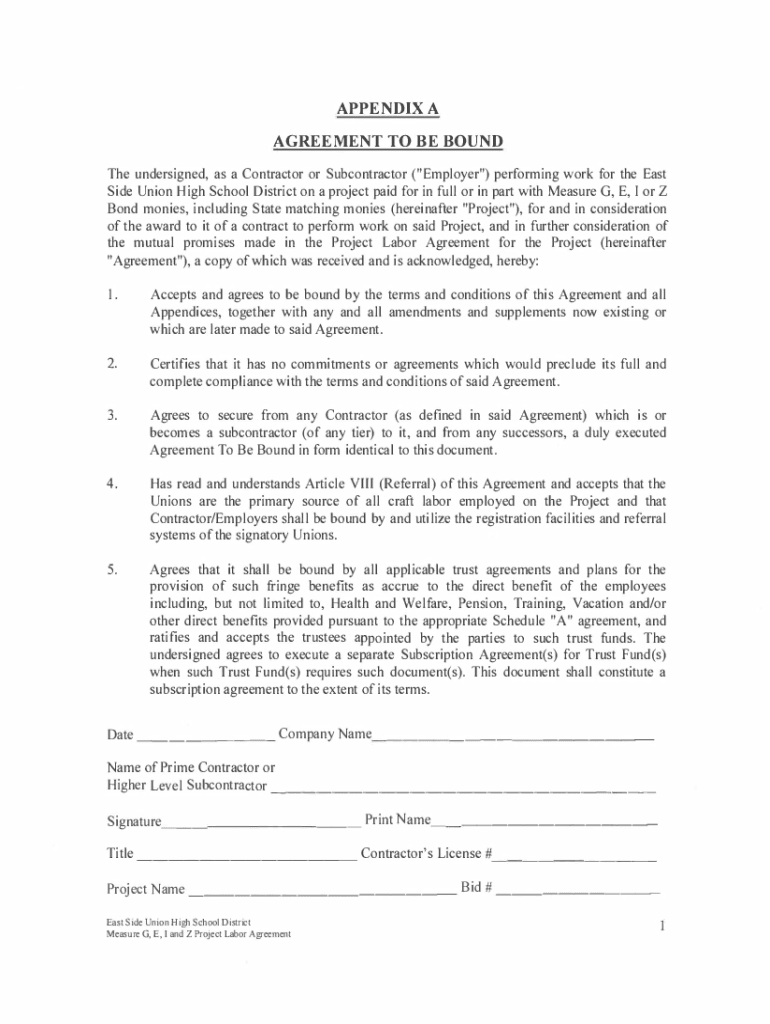 EAST SIDE UNION HIGH SCHOOL DISTRICT Contractors Guide to the Project Labor Agreement 1. Project Labor Agreements Project Labor Agreements (PLA) are a legally recognized form of rehire agreement.