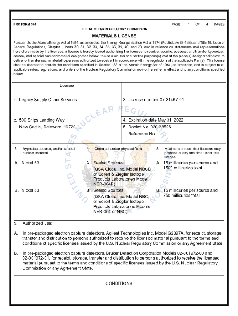 PAGE NRC FORM 3741OF4PAGESU. S. NUCLEAR REGULATORY COMMISSIONMATERIALS LICENSE Pursuant to the Atomic Energy Act of 1954, as amended, the Energy Reorganization Act of 1974 (Public Law 93438), and