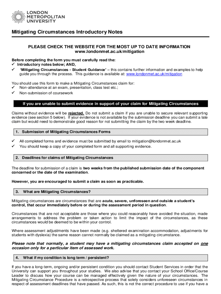 Mitigating Circumstances Introductory NotesPLEASE CHECK THE WEBSITE FOR THE MOST UP TO DATE INFORMATION www.londonmet.ac.uk/mitigationBefore completing the form you must carefully read the: