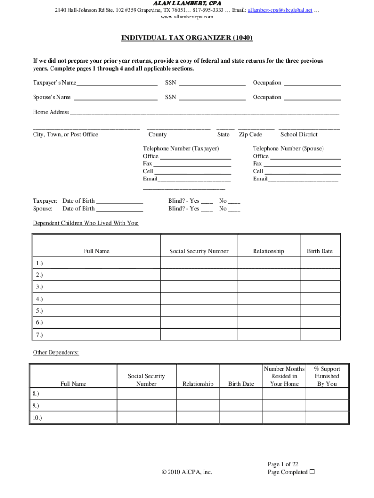 ALAN L LAMBERT, CPA 2140 Hall Johnson Rd Ste. 102 #359 Grapevine, TX 76051 8175953333 Email: allambertcpa@sbcglobal.net www.allambertcpa.comINDIVIDUAL TAX ORGANIZER LETTER FORM 1040 Enclosed is an
