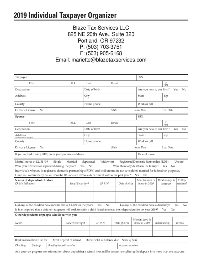 2019 Individual Taxpayer Organizer Blaze Tax Services LLC 825 NE 20th Ave., Suite 320 Portland, OR 97232 P: (503) 7033751 F: (503) 9056168 Email: mariette@blazetaxservices.com SSNTaxpayerFirstIP Minefield.
