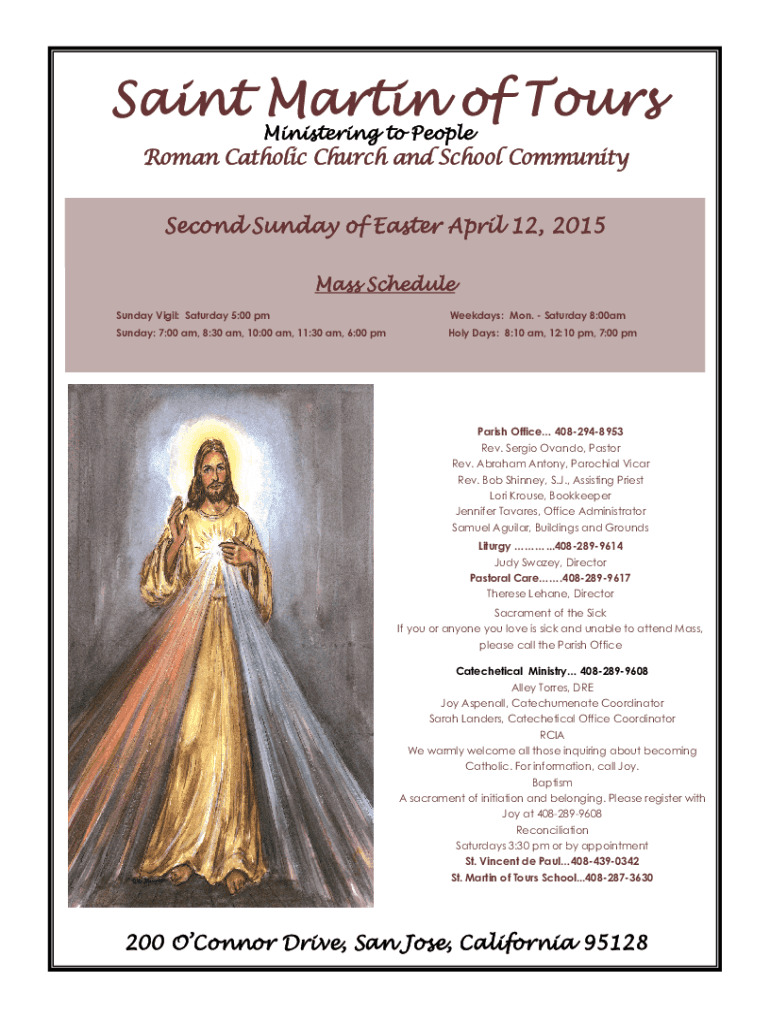 Saint Martin of Tours Ministering to People Roman Catholic Church and School Community Second Sunday of Easter April 12, 2015, Mass Schedule Sunday Vigil: Saturday 5:00 weekdays: Mon. Saturday 8:00amSunday: