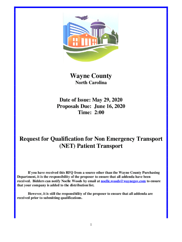 Wayne County North CarolinaDate of Issue: May 29, 2020, Proposals Due: June 16, 2020, Time: 2:00Request for Qualification for Non-Emergency Transport (NET) Patient Transport you have received this