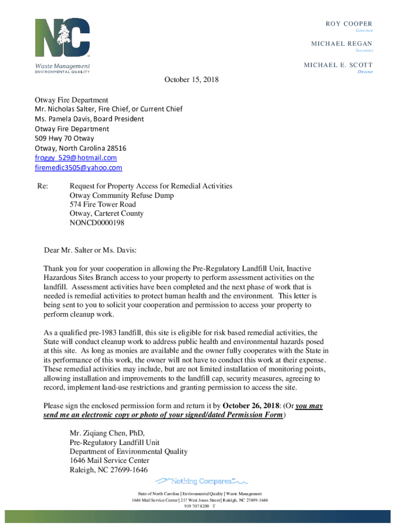 R OF C OOP E R Governor H AE L RE G AN Secretary H AE L E. S C OT T Director October 15, 2018, Away Fire Department Mr. Nicholas Salter, Fire Chief, or Current Chief Ms. Pamela Davis, Board President