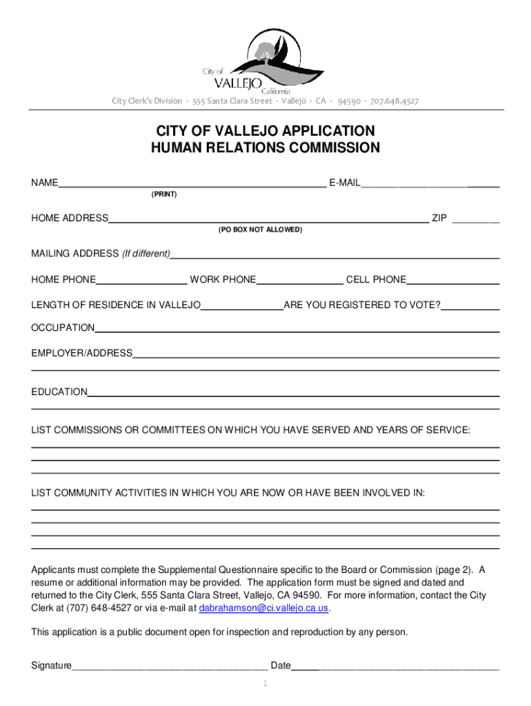 City Clerks Division 555 Santa Clara Street Vallejo CA 94590 707.648.4527CITY OF VALLEJO APPLICATION HUMAN RELATIONS COMMISSION NAMEEMAIL___ (PRINT)HOME ADDRESS ZIP ___ (PO BOX NOT ALLOWED)MAILING