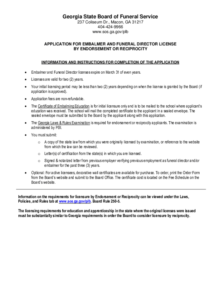 Georgia State Board of Funeral Service 237 Coliseum Dr., Macon, GA 31217 4044249966 www.sos.ga.gov/plb APPLICATION FOR EMBALMER AND FUNERAL DIRECTOR LICENSE BY ENDORSEMENT OR RECIPROCITY INFORMATION
