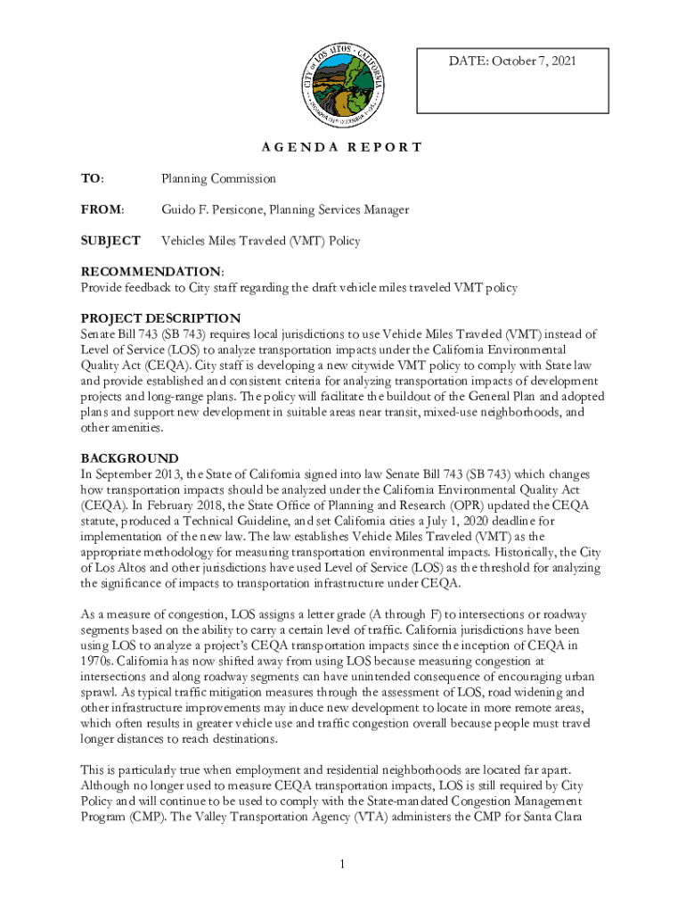 DATE: October 7, 2021AGENDA REPORT TO:Planning Commissioner:Guido F. Periscope, Planning Services ManagerSUBJECTVehicles Miles Traveled (BMT) PolicyRECOMMENDATION: Provide feedback to City staff regarding