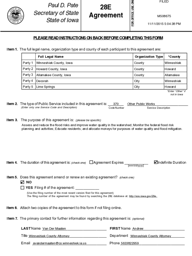 28E Agreement OFFICE USE ON Paul D. Pate Secretary of State of IowaFILEDM508675 11/11/2015 5:04:38 PLEASE READ INSTRUCTIONS ON BACK BEFORE COMPLETING THIS FORM Item 1. The full legal name, organization