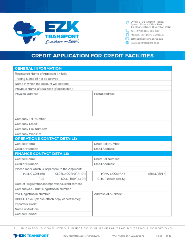 Office B106, Lincoln House, Epsom Downs Office Park, 13 Sloane Street, Branson 2060. Tel: +27 (0) 844 860 587 Mobile: +27 (0) 72 349 8989 admin@ezktransport.co.za www.ezktransport.co.zaCREDIT APPLICATION