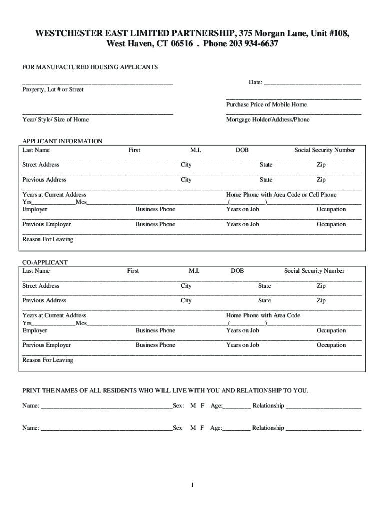 WESTCHESTER EAST LIMITED PARTNERSHIP, 375 Morgan Lane, Unit #108, West Haven, CT 06516. Phone 203 9346637 FOR MANUFACTURED HOUSING APPLICANTS ___ Property, Lot # or Streetcar: ___ ___ Purchase Price