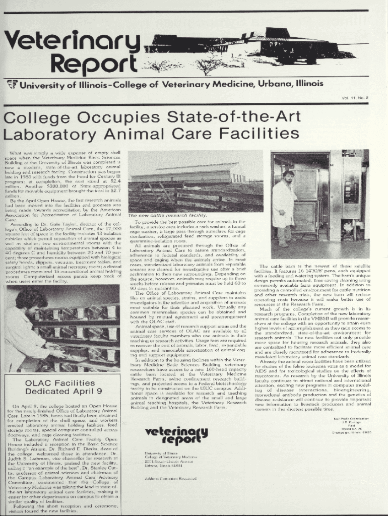 Veterinary Report University of IllinoisCollege of Veterinary Medicine, Urbana, Illinois Vol. 11, No. 2College Occupies StateoftheArt Laboratory Animal Care Facilities What was simply a wide expanse
