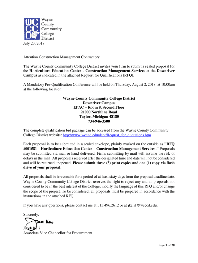 July 23, 2018Attention Construction Management Contractors: The Wayne County Community College District invites your firm to submit a sealed proposal for the Horticulture Education Center Construction