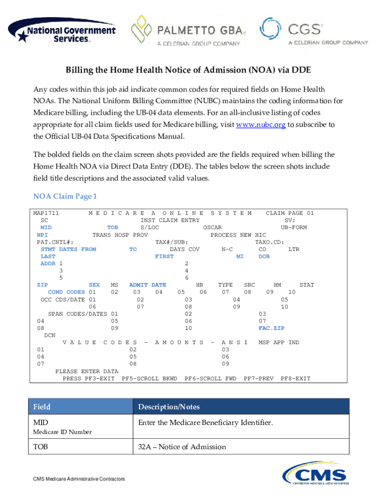 Billing the Home Health Notice of Admission (NOA) via DDE Any codes within this job aid indicate common codes for required fields on Home Health NOAA. The National Uniform Billing Committee (NUB)