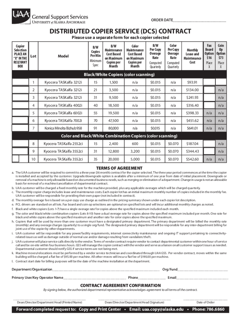 ORDER DATE___DISTRIBUTED COPIER SERVICE (DCS) CONTRACT Please use a separate form for each copier selectedCopier Selection PLACE AN X IN THE Lot RELEVANT BOX/W B/W Copies Maintenance Per Min Cost