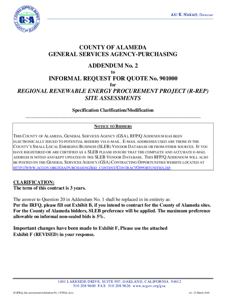 COUNTY OF ALAMEDA GENERAL SERVICES AGENCYPURCHASING ADDENDUM No. 2 informal REQUEST FOR QUOTE No. 901000 regional RENEWABLE ENERGY PROCUREMENT PROJECT (PREP) SITE ASSESSMENTS Specification Clarification/Modification