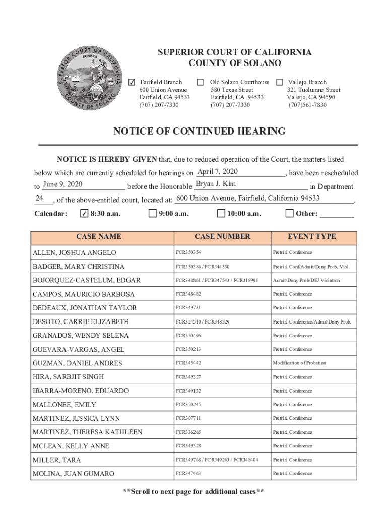 Get the free NOTICE OF CONTINUED HEARING - California - solano courts ca