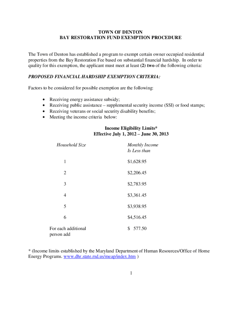 TOWN OF DENTON BAY RESTORATION FUND EXEMPTION Procedure Town of Denton has established a program to exempt certain owner occupied residential properties from the Bay Restoration Fee based on substantial