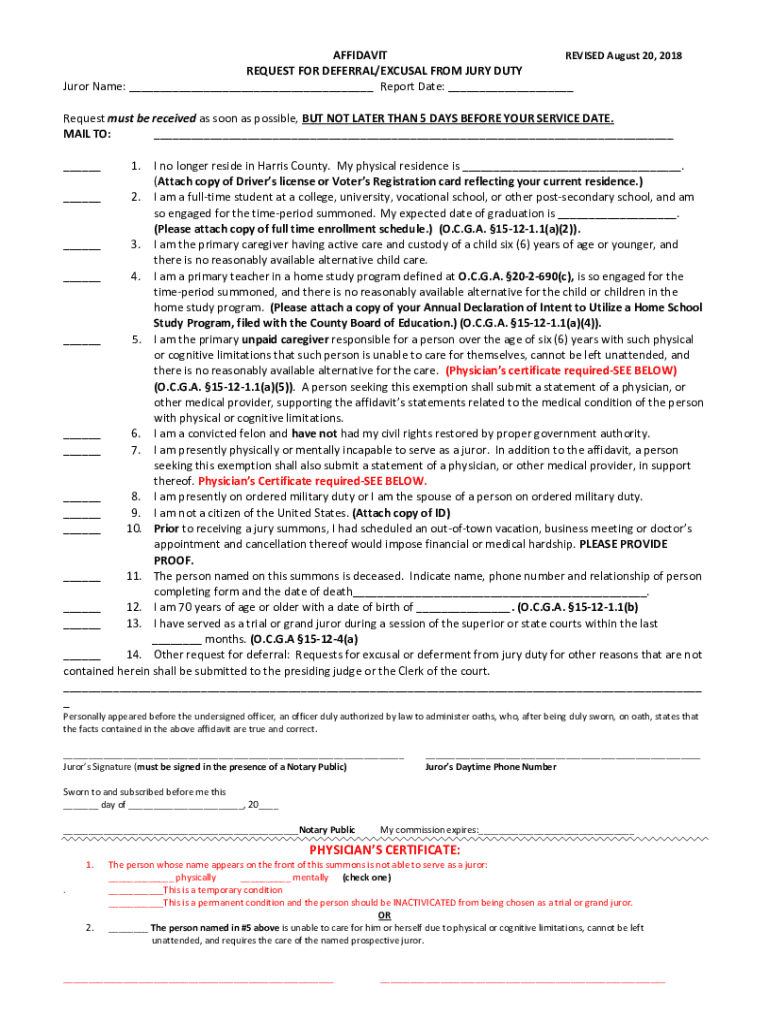 AFFIDAVIT REVISED August 20, 2018, REQUEST FOR DEFERRAL/EXCUSE FROM JURY DUTY Juror Name: ___ Report Date: ___ Request must be received as soon as possible, BUT NOT LATER THAN 5 DAYS BEFORE YOUR SERVICE