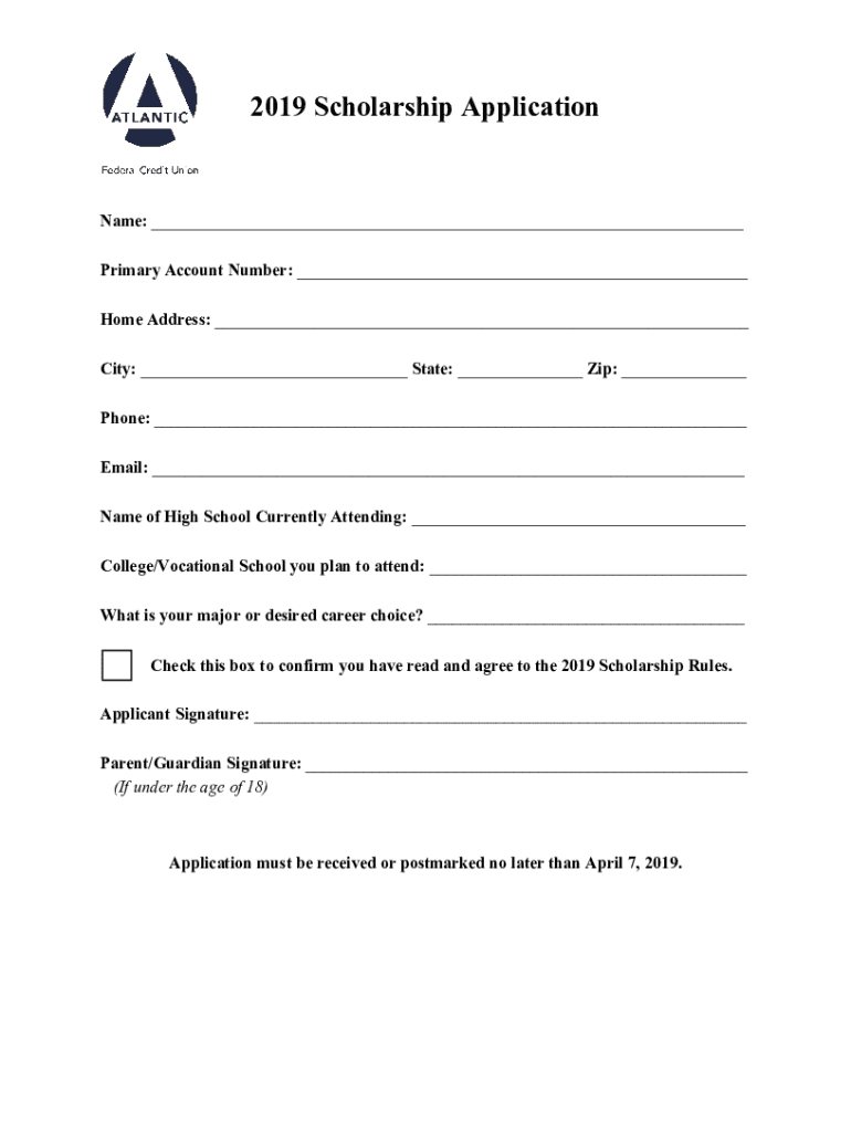2019 Scholarship Application Atlantic Federal Credit Union is pleased to offer a scholarship program to members who are high school seniors. A $7,500, $2,500, $1,000 and eight $500 scholarships will