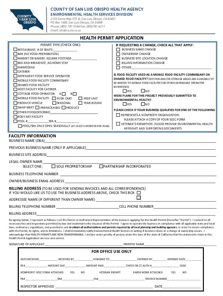 Print Forecourt OF SAN LUIS OBISPO HEALTH AGENCY ENVIRONMENTAL HEALTH SERVICES DIVISIONClear All2156 Sierra Way STE. B, San Luis Obispo, CA 93401 PO Box 1489, San Luis Obispo, CA 93406 Phone: (805)