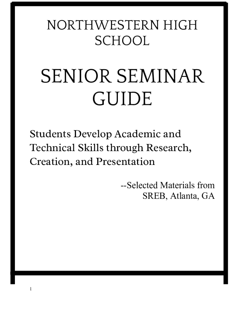 NORTHWESTERNHIGH SCHOOL SENIORSEMINAR GUIDE StudentsDevelopAcademicand TechnicalSkillsthroughResearch, Creation, representation SelectedMaterialsfrom SEB, Atlanta, GA 1 TableofContents