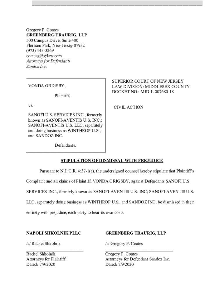 MIDL00768018 07/10/2020 9:41:08 AM Pg 1 of 2 Trans IDs: LCV20201199870 ___Gregory P. Coates GREENBERG TRAINING, LLP 500 Campus Drive, Suite 400 Flora Park, New Jersey 07932 (973) 4433269 coatesg@gtlaw.com