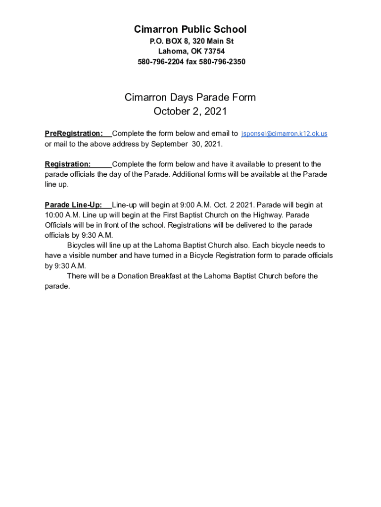 Cimarron Public School P.O. BOX 8, 320 Main St Tahoma, OK 73754 5807962204 fax 5807962350Cimarron Days Parade Form October 2, 2021, Preregistration: Complete the form below and email to jsponsel@cimarron.k12.ok.us