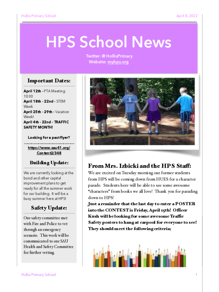April 8, 2022HPS School News Twitter: @ HollisPrimary Website: maps. Important Dates: April 12th PTA Meeting 10:00 April 18th 22nd STEM Week April 25th 29th Vacation Week! April 4th 22nd TRAFFIC SAFETY