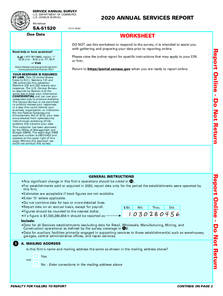 OMB No. 06070422: Approval Expires: 12/31/2021SERVICE ANNUAL SURVEY U.S. DEPARTMENT OF COMMERCE U.S. CENSUS BUREAU2020 ANNUAL SERVICES REPORTWorksheet FORMSA51520 Due Catcall 18777879860, option \”
