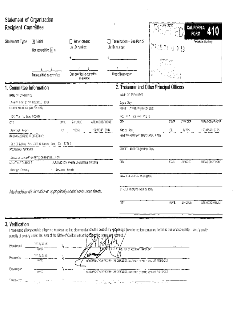 Statement of Organization Recipient Committee Statement Typer,r1 DInitialNot yet qualifiedIKJDAmendmentList J.D. number:or, QAT!\” Star, P., ., 1\'I.,,,;ITN;:CALIFORNIA FORM41 0For Official Use