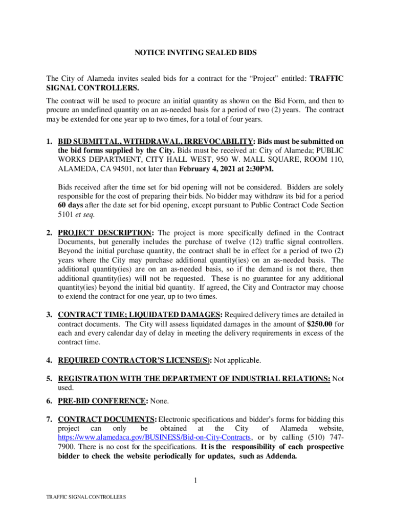 NOTICE INVITING SEALED BIDS The City of Alameda invites sealed bids for a contract for the Project entitled: TRAFFIC SIGNAL CONTROLLERS. The contract will be used to procure an initial quantity as