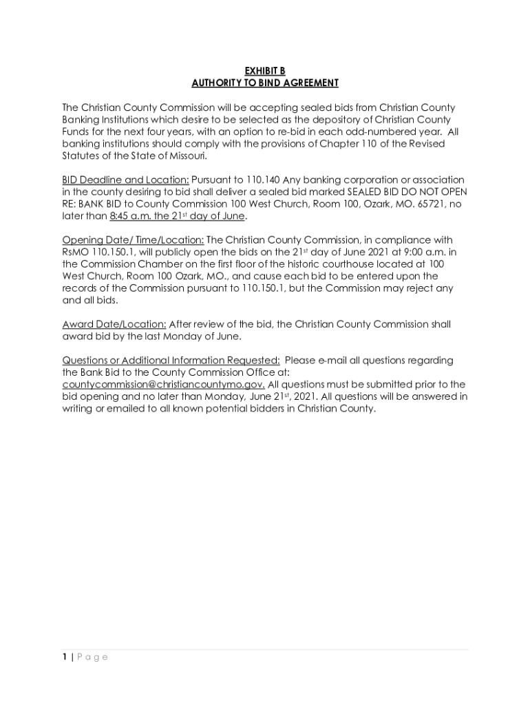 EXHIBIT B AUTHORITY TO BIND AGREEMENT The Christian County Commission will be accepting sealed bids from Christian County Banking Institutions which desire to be selected as the depository of Christian