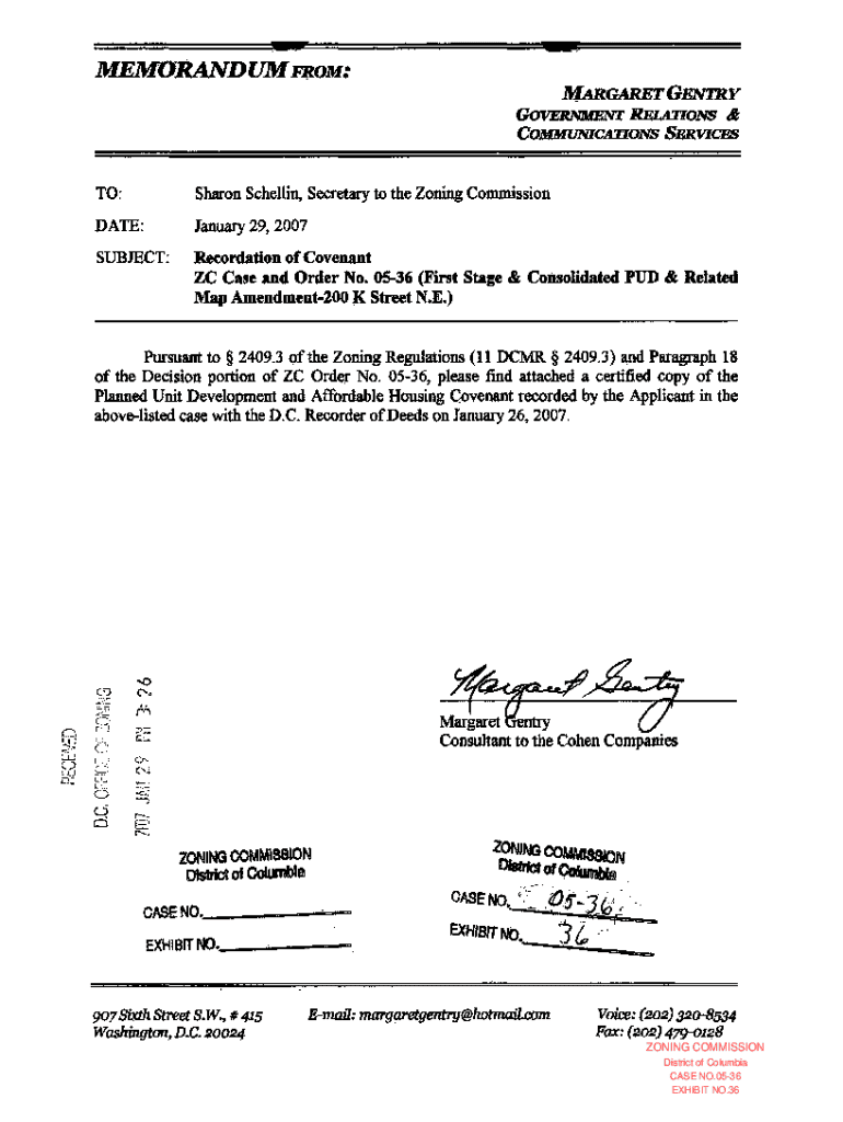 MEMORANDUM FROM:.MARGARET GENTRY Government RELATIONS ct COMMUNICATIONS SERVICE STO:Sharon Schelling, Secretary to the Zoning Compassionate:January 29, 2007SUBJECT;Decoration of Covenant ZC Case and