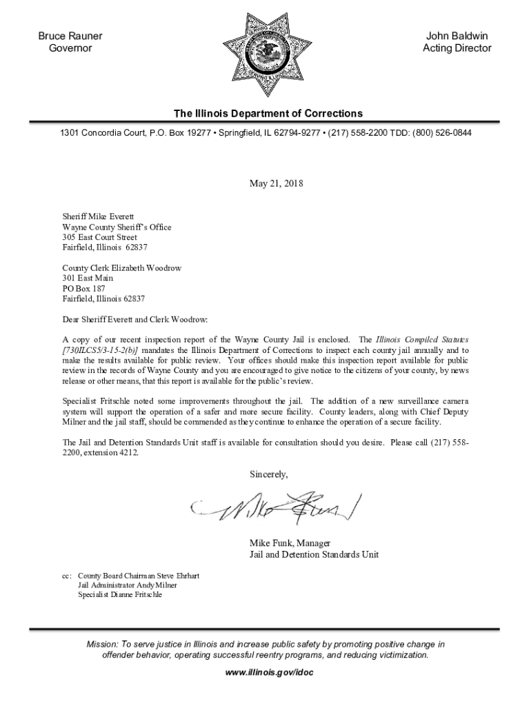 Bruce Rather Governor John Baldwin Acting Directorate Illinois Department of Corrections 1301 Concordia Court, P.O. Box 19277 Springfield, IL 627949277 (217) 5582200 TDD: (800) 5260844May 21, 2018