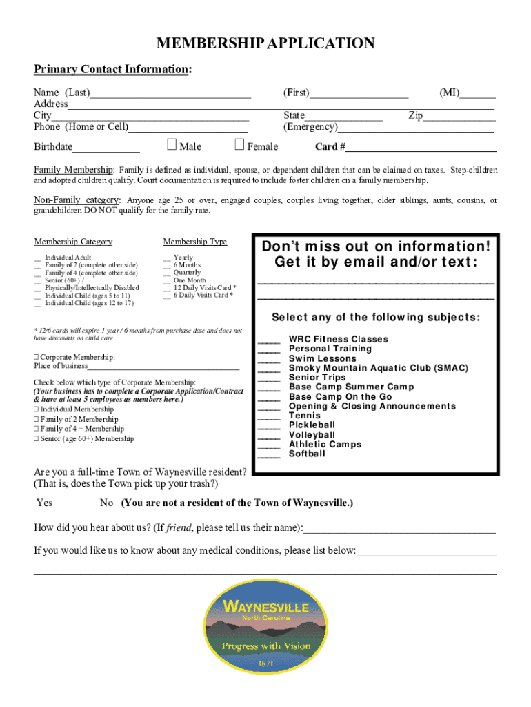 MEMBERSHIP APPLICATION Primary Contact Information: Name (Last)___ (First)___ (MI)___ Address___ City___ State___ Zip___ Phone (Home or Cell)___ (Emergency)___ Birthdate___MaleFemaleCard #___Family