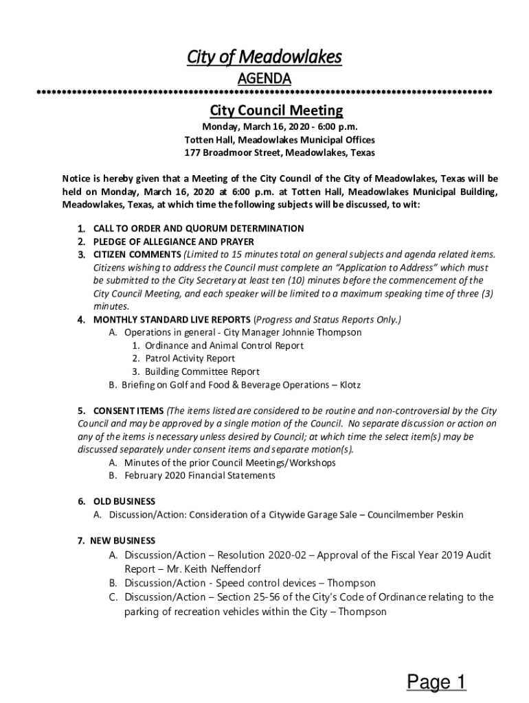 City of Meadow lakes AGENDA ******************************************************************************************City Council Meeting Monday, March 16, 2020 6:00 p.m. Gotten Hall, Meadow lakes