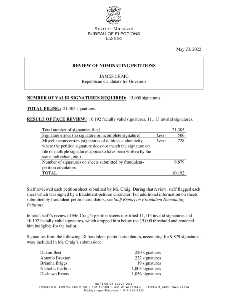 STATE OF MICHIGAN BUREAU OF ELECTIONS LANSING May 23, 2022REVIEW OF NOMINATING PETITIONS JAMES CRAIG Republican Candidate for GovernorNUMBER OF VALID SIGNATURES REQUIRED: 15,000 signatures. TOTAL