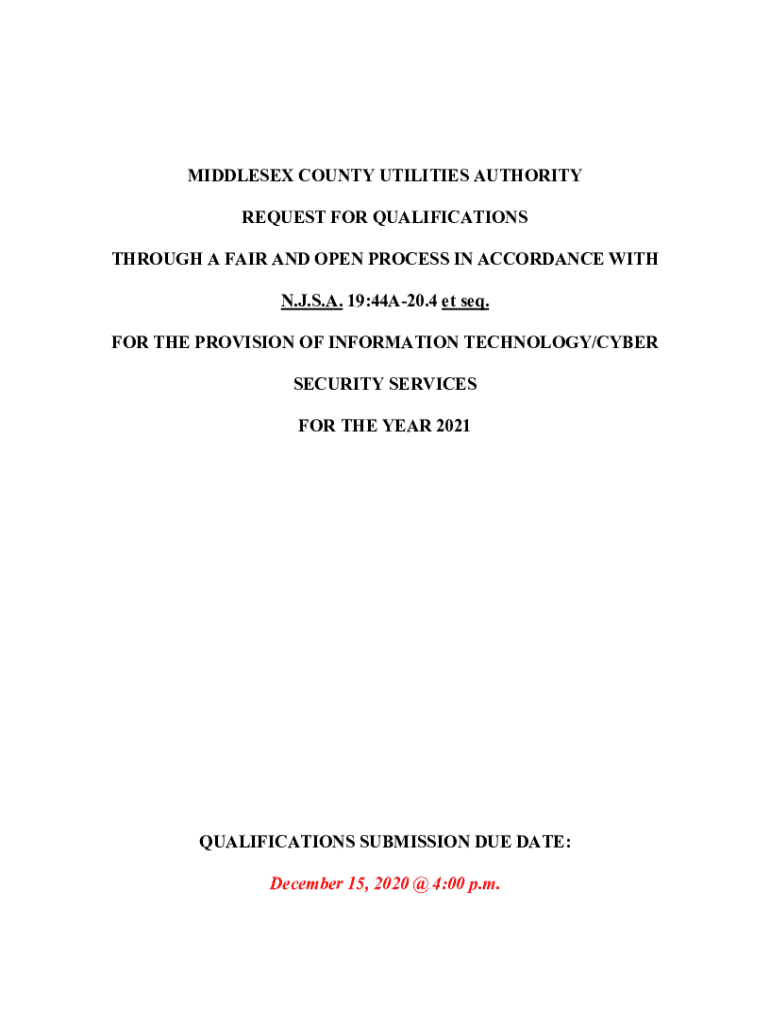 MIDDLESEX COUNTY UTILITIES AUTHORITY REQUEST FOR QUALIFICATIONS THROUGH A FAIR AND OPEN PROCESS IN ACCORDANCE WITH N.J.S.A. 19:44A20.4 et seq. FOR THE PROVISION OF INFORMATION TECHNOLOGY/Cybersecurity
