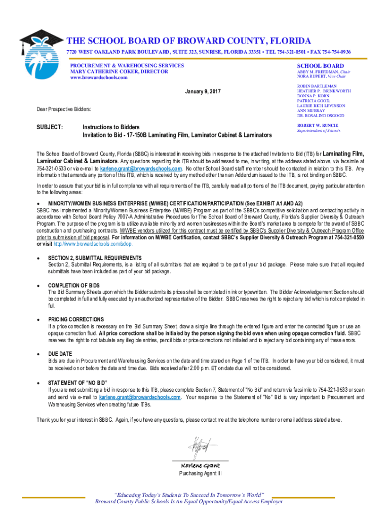 THE SCHOOL BOARD OF BROWARD COUNTY, FLORIDA 7720 WEST OAKLAND PARK BOULEVARD, SUITE 323, SUNRISE, FLORIDA 33351 TEL 7543210501 FAX 7547540936 PROCUREMENT & WAREHOUSING SERVICES MARY CATHERINE COVER,