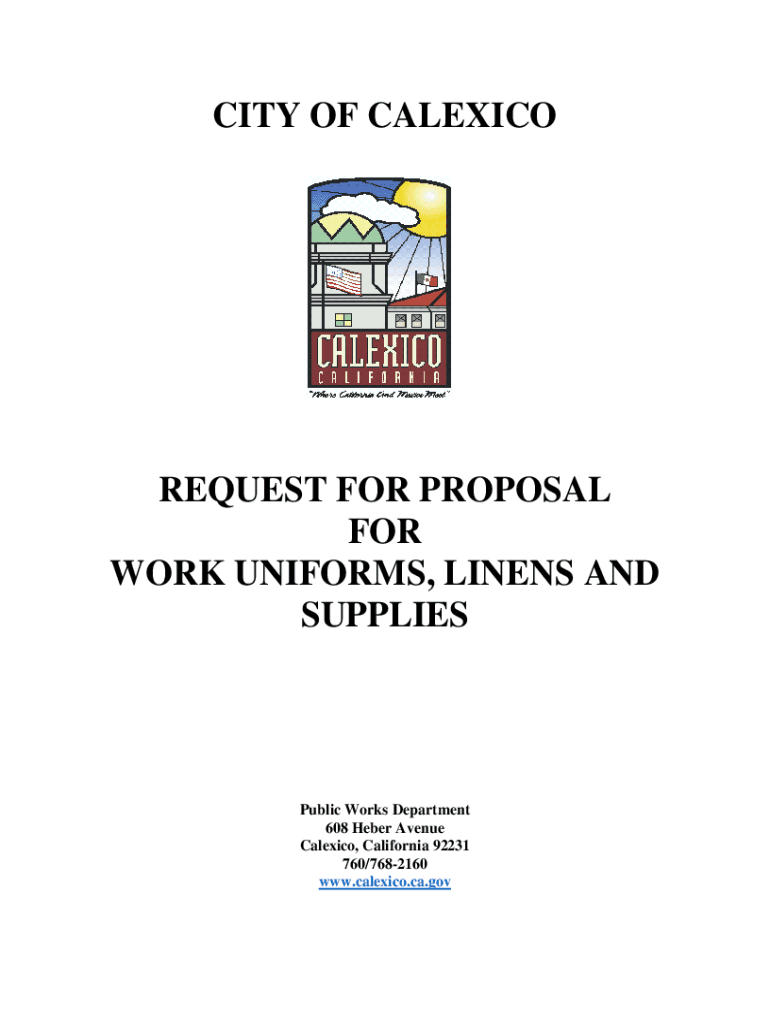 CITY OF CALEXICOREQUEST FOR PROPOSAL FOR WORK UNIFORMS, LINENS AND SUPPLIESPublic Works Department 608 Weber Avenue Calexico, California 92231 760/7682160 www.calexico.ca.govCITY OF CALEXICO PUBLIC