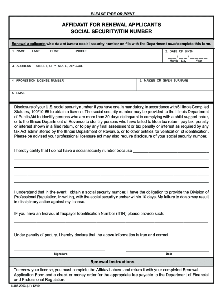 PLEASE TYPE OR PRINTAFFIDAVIT FOR RENEWAL APPLICANTS SOCIAL SECURITY/ITIN NUMBER Renewal applicants who do not have a social security number on file with the Department must complete this form. 1.NAMELASTFIRSTMIDDLE2.DATE