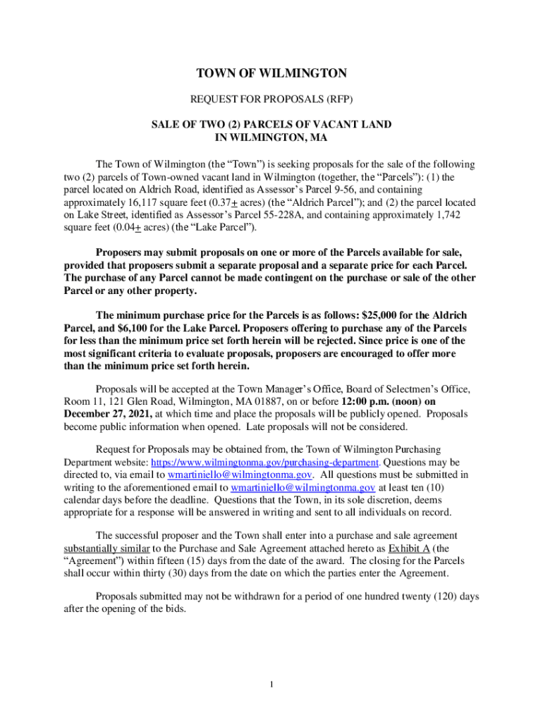 TOWN OF WILMINGTON REQUEST FOR PROPOSALS (RFP) SALE OF TWO (2) PARCELS OF VACANT LAND IN WILMINGTON, MA The Town of Wilmington (the Town) is seeking proposals for the sale of the following two (2)