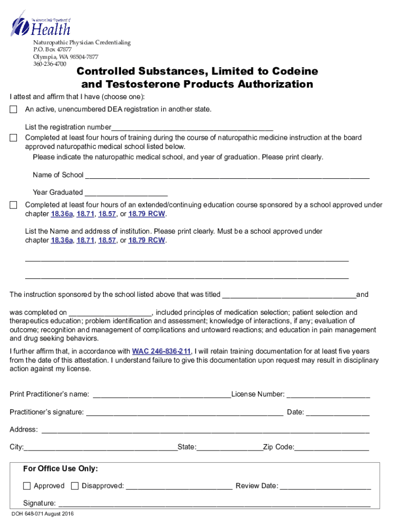 Naturopathic Physician Credentialing P.O. Box 47877 Olympia, WA 985047877 3602364700Controlled Substances, Limited to Codeine and Products Authorization attest and affirm that I have (choose one):