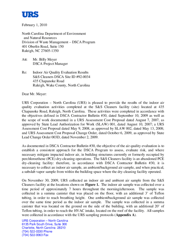 February 1, 2010, North Carolina Department of Environment and Natural Resources Division of Waste Management DSC Program 401 Oberlin Road, Suite 150 Raleigh, NC 276051350 ATT:Mr. Billy Meyer DSC