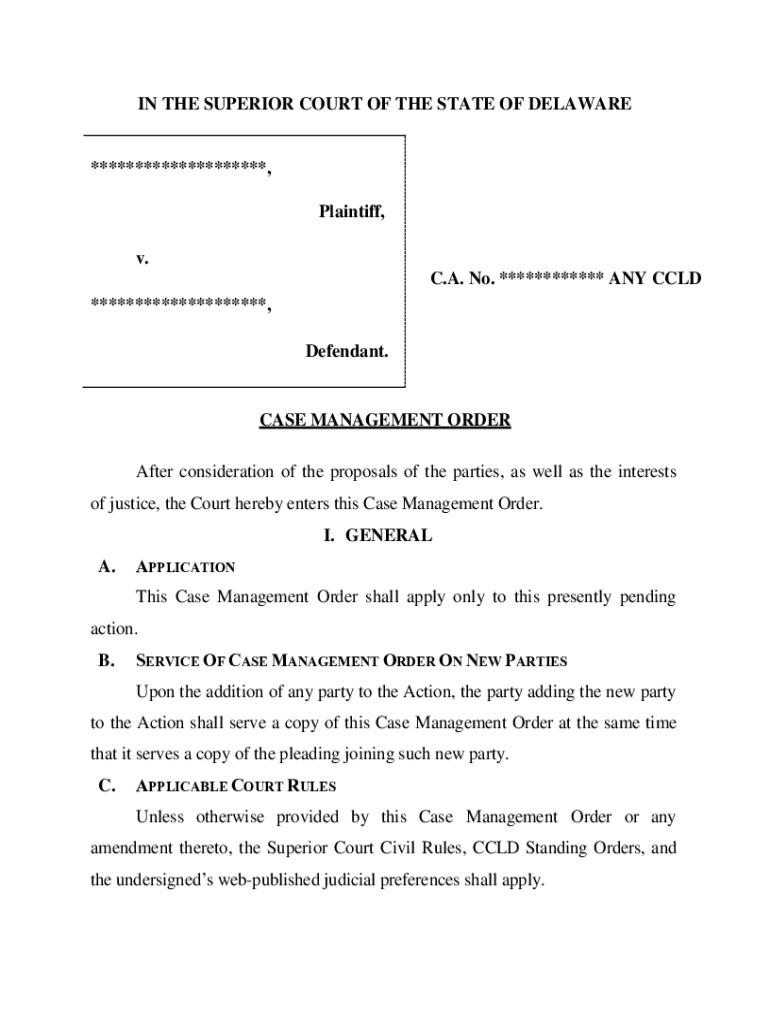 IN THE SUPERIOR COURT OF THE STATE OF DELAWARE********************, Plaintiff, v. C.A. No. ************ ANY COLD ********************, Defendant. CASE MANAGEMENT ORDER After consideration of the proposals