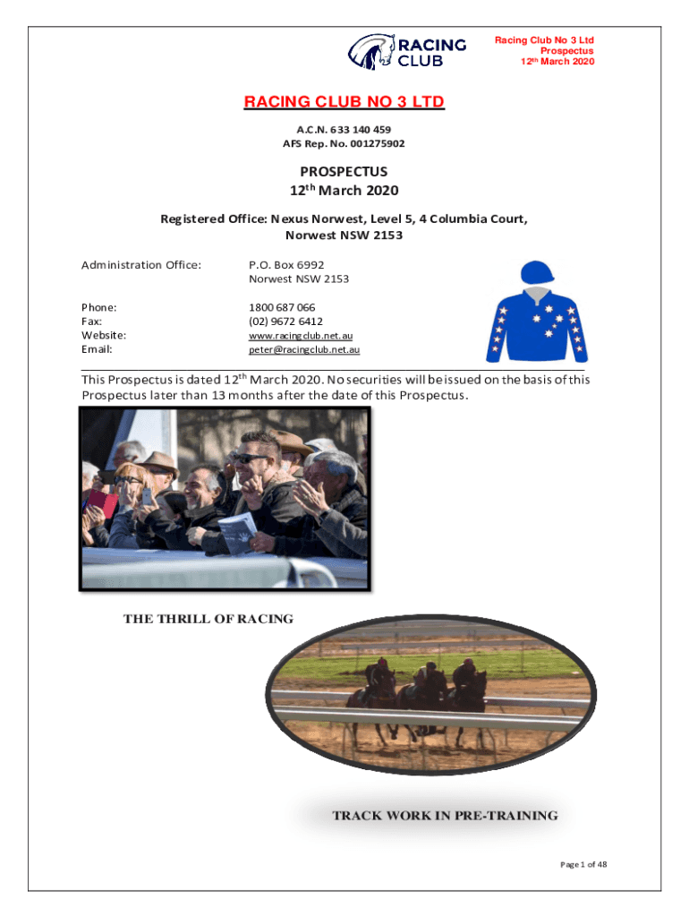 Racing Club No 3 Ltd Prospectus 12th March 2020RACING CLUB NO 3 LTD A.C.N. 633 140 459 AFS Rep. No. 001275902PROSPECTUS 12th March 2020 Registered Office: Nexus Nor west, Level 5, 4 Columbia Court,